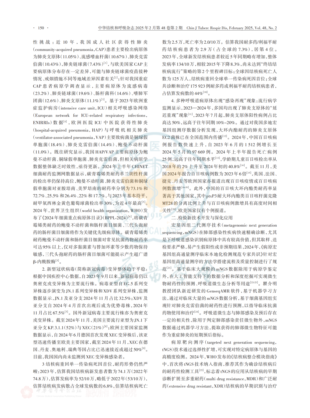 2024年度,呼吸感染性疾病依然是全球公共健康的严峻挑战,抗生素耐药性、病程复杂性和传播广泛性共同加重了全球居民的疾病负担。与此同时,优先病原体清单的更新、多种病原体的“感染再现”现象等,为呼吸感染性疾病诊治带来了新的压力和挑战。过去1年,在感染病原学快速诊断技术研发、抗感染新药与疫苗的研发等领域有众多研究成果面世,《呼吸感染性疾病诊治年度进展2024》从疾病流行现状、新型检验技术、抗感染药物开发和疾病预防康复4个方面,总结和回顾过去1年的重要研究进展,为未来呼吸感染性疾病防控与诊治的临床实践提供参考。